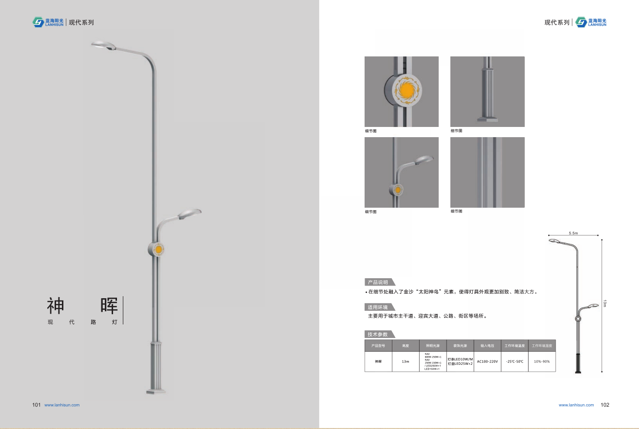 1、高度為6-16米; 2、光源為2組LED光源,色溫2500-6500K,每個光源功率為60-300W; 3、LED驅動電源壽命可達五年; 4、整體熱鍍鋅噴塑,保證燈桿15年不生銹; 5、可以根據使用地區的地域文化、產業特點等進行文化定制;
