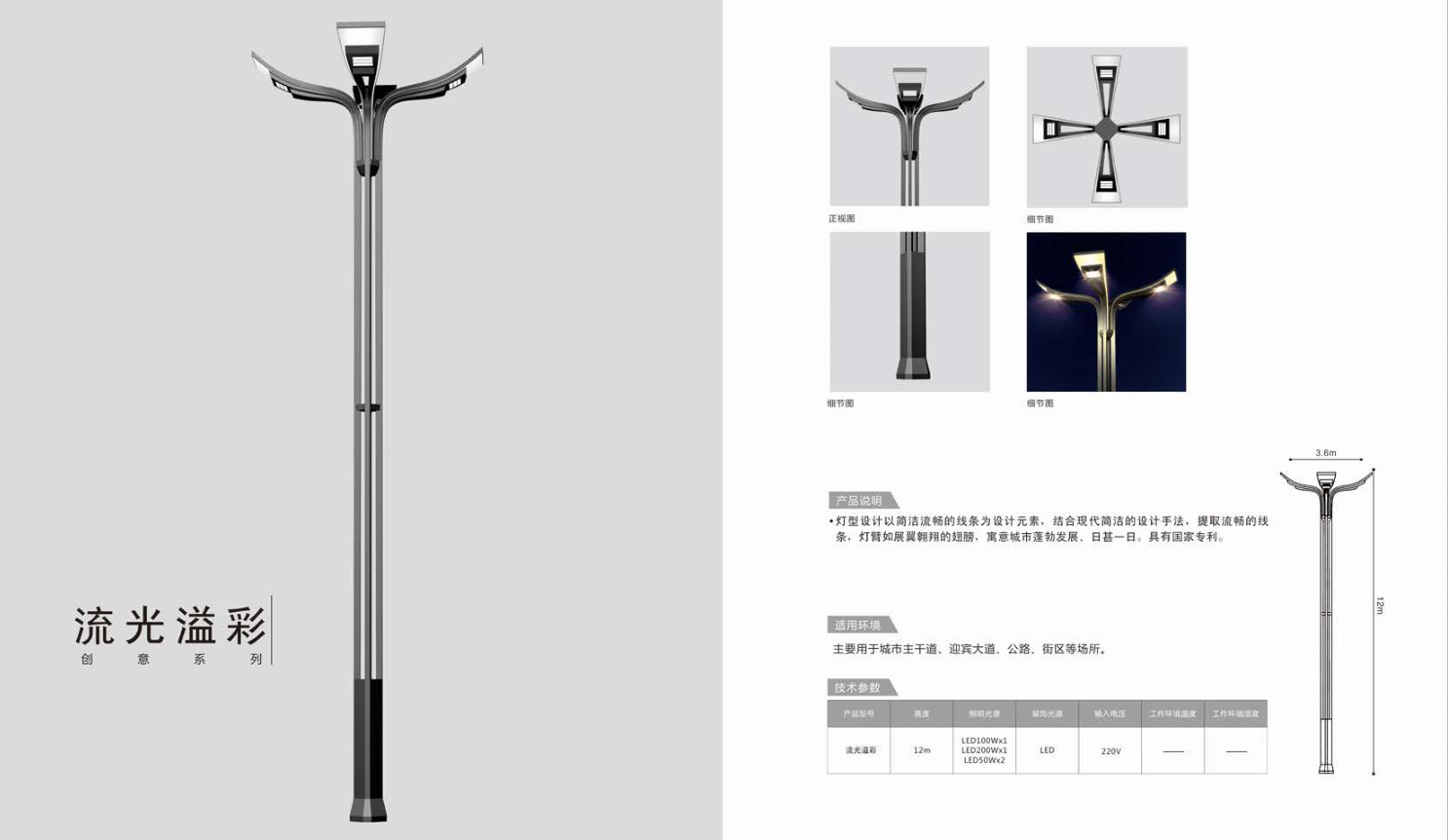 1、高度為6-16米; 2、光源為4組LED光源,色溫2500-6500K,每個光源功率為60-300W,頂部為七彩球構成; 3、LED驅動電源壽命可達五年; 4、整體熱鍍鋅噴塑,保證燈桿15年不生銹; 5、可以根據使用地區的地域文化、產業特點等進行文化定制;